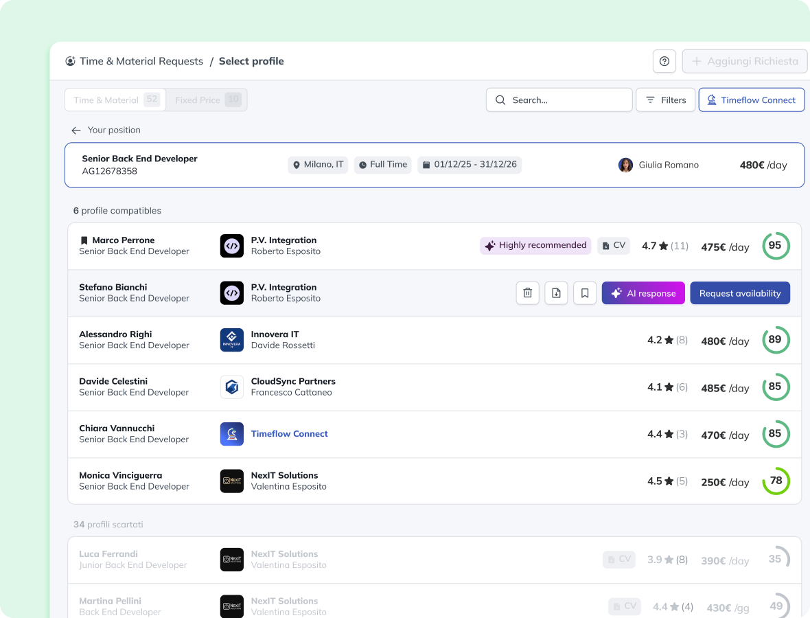 Find the right profile in seconds. TimeFlow’s AI automatically connects project needs with the best-fit talent — no manual screening required.
