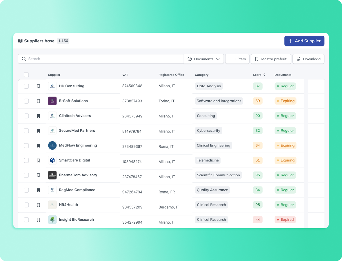 Each supplier is rated on performance, compliance, and reliability. Scores update automatically after every project.
