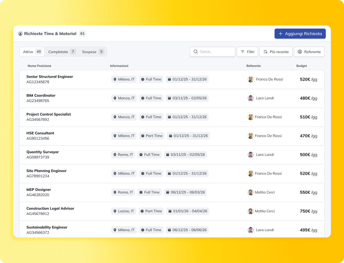 Un unico workspace per Acquisti, Tecnici, PM e HR, per assegnare incarichi, tracciare documenti e coordinare tutte le attività.